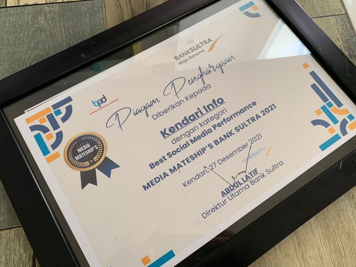 Kantor berita kendariinfo.com raih penghargaan dari Bank Sultra dalam kategori Best Performance Social Media. Foto: Kendariinfo. (27/12/2021).