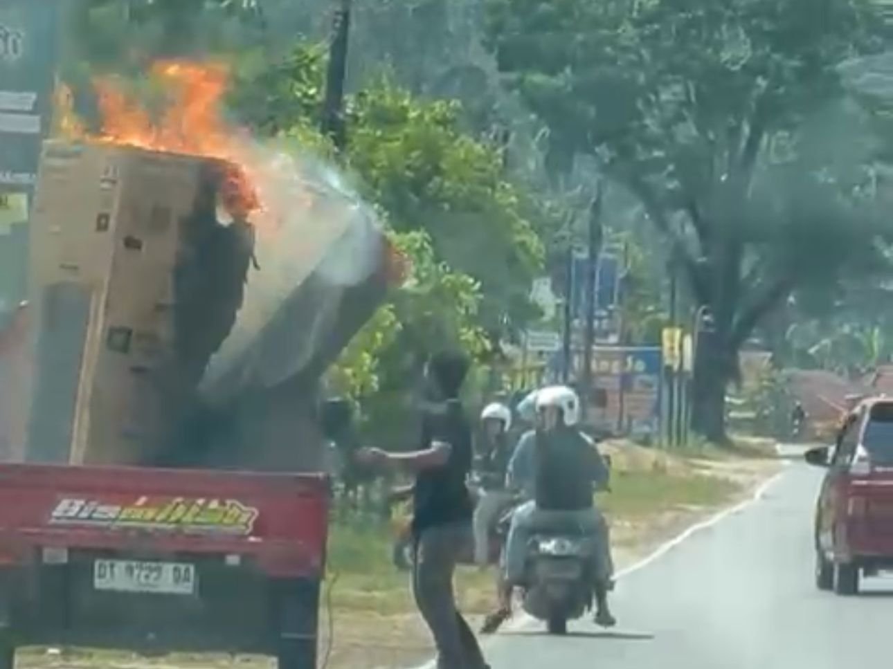 Dalam rekaman video terlihat api membesar dari kotak kardus kulkas yang diletakkan di bak belakang mobil pikap warna merah. Bahkan, kulkas yang terbakar terjatuh di jalan. Asap tebal mengepul hingga membuat sejumlah pengendara yang melintas sempat memperlambat laju kendaraan mereka.