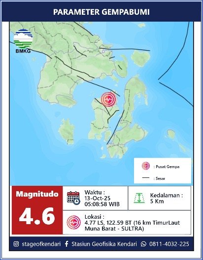 “Gempa Mag: 4.6, 13-Oct-25 05:08:58 WIB, Lok:4.77 LS, 122.59 BT (16 km TimurLaut Muna Barat – SULTRA ), Kedlmn: 5 Km,” tulis Kepala Stasiun Geofisika Kendari, Rudin dalam laporannya.