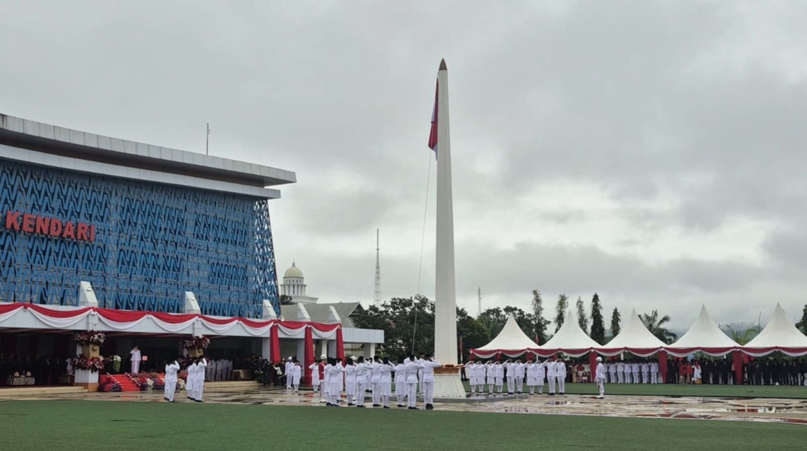Dengan langkah tegap menembus genangan air, Paskibraka berhasil menjalankan tugas tanpa cela. Tepuk tangan haru pun pecah saat bendera berkibar gagah di langit Kota Kendari.