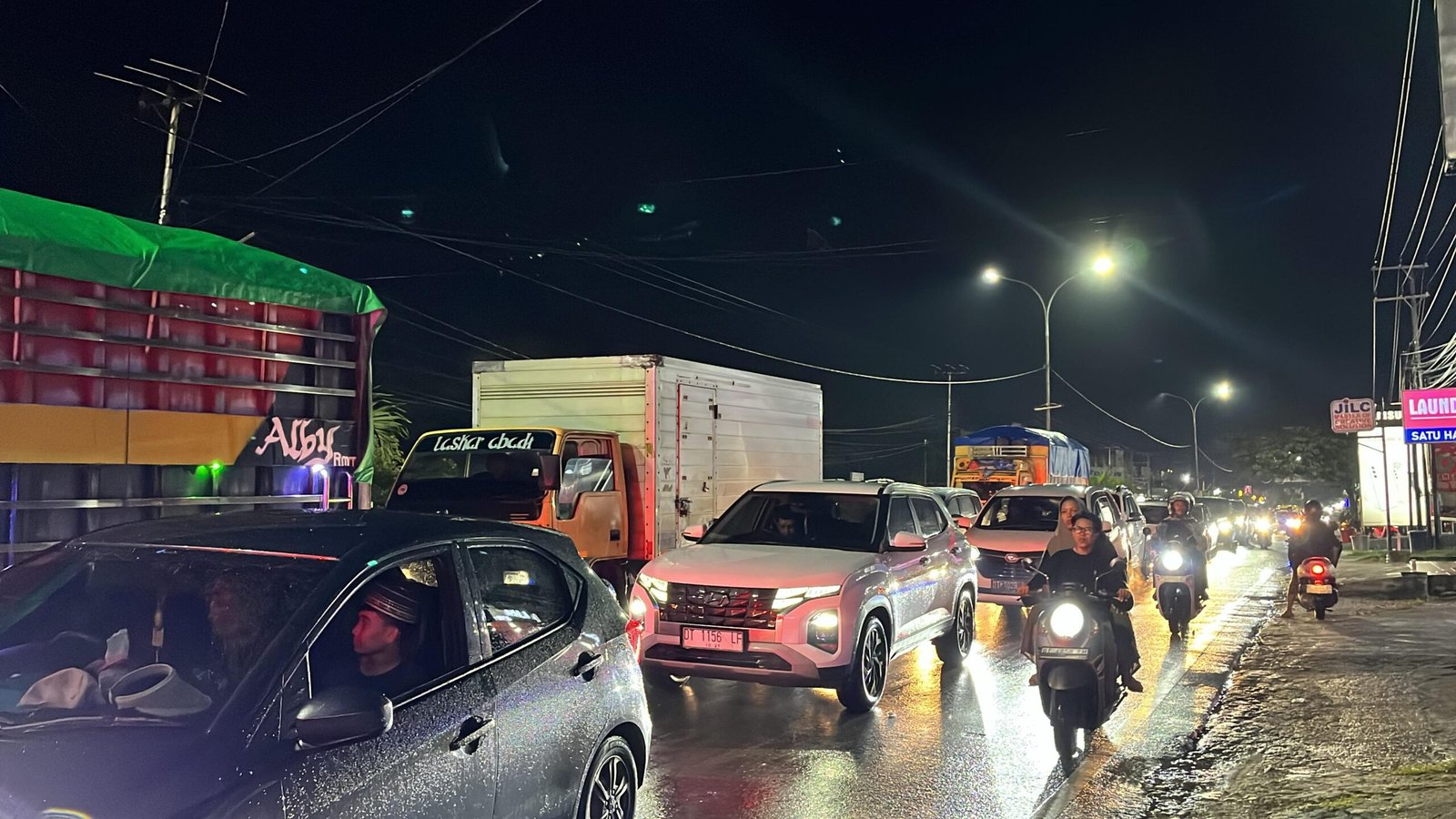 Antrean kendaraan mengular hingga ke depan Lorong Kancil di Jalan Bunggasi. Akibat kemacetan, sebagian kendaraan roda dua memutuskan untuk memutar balik untuk menghindari antrean panjang.