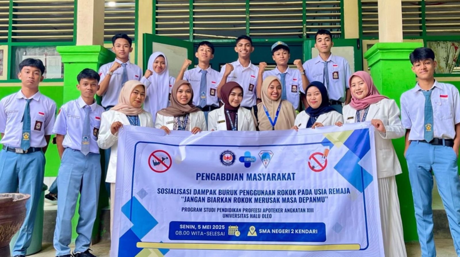 Kendari – Mahasiswa Program Studi Pendidikan Profesi Apoteker (PSPPA) Angkatan XIII Universitas Halu Oleo (UHO) menggelar sosialisasi bahaya rokok dan vape kepada siswa SMAN 2 Kendari, Senin (5/5/2025). Kegiatan ini merupakan bagian dari program pengabdian masyarakat yang berfokus pada peningkatan kesadaran kesehatan remaja.