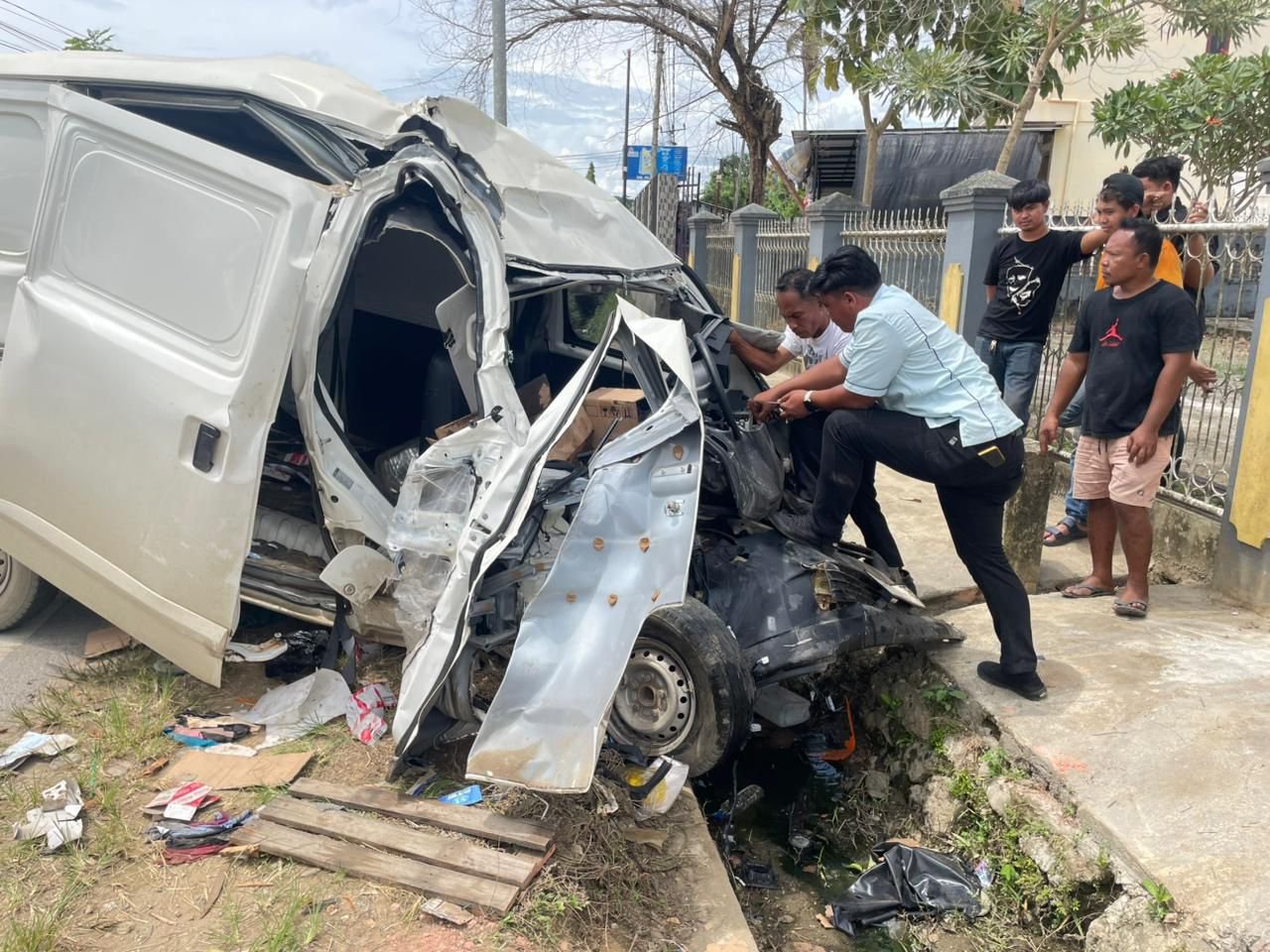 Minibus warna putih masuk ke selokan usai menabrak truk bermuatan pasir di Jalan Pattimura, Kelurahan Watulondo, Kecamatan Puuwatu, Kota Kendari. Foto: Istimewa. (3/12/2025).