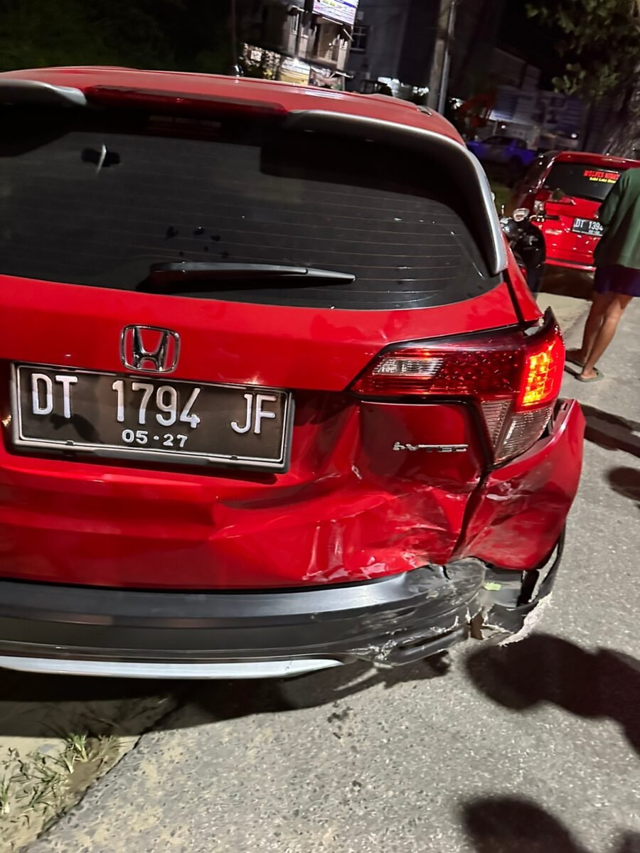 Kendari – Mobil Honda HR-V yang sedang parkir di pinggir jalan ditabrak oleh mobil Daihatsu Sigra di Kelurahan Kambu, Kecamatan Kambu, Kota Kendari, Sulawesi Tenggara (Sultra), Jumat (23/12/2022).