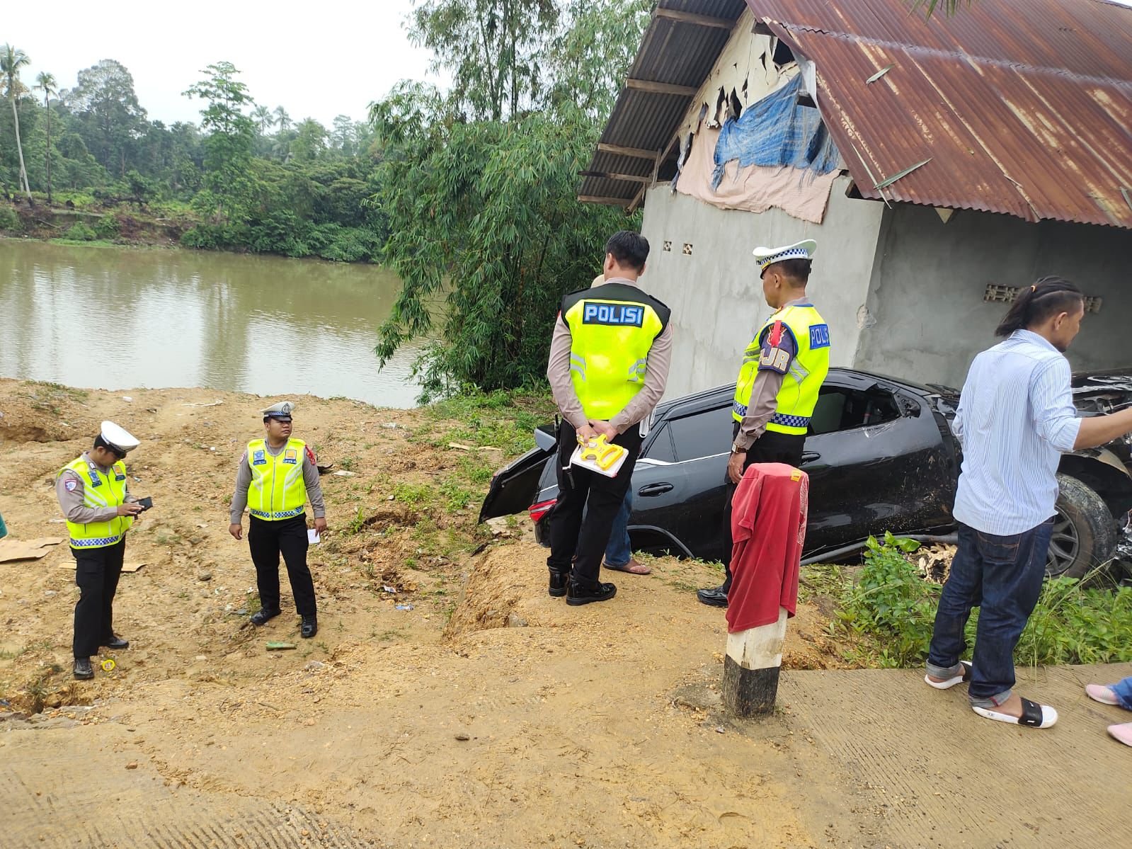Mobil berwarna hitam tersebut dilaporkan mengalami kerusakan cukup parah di bagian depan dan nyaris menabrak rumah warga di tepi jalan.