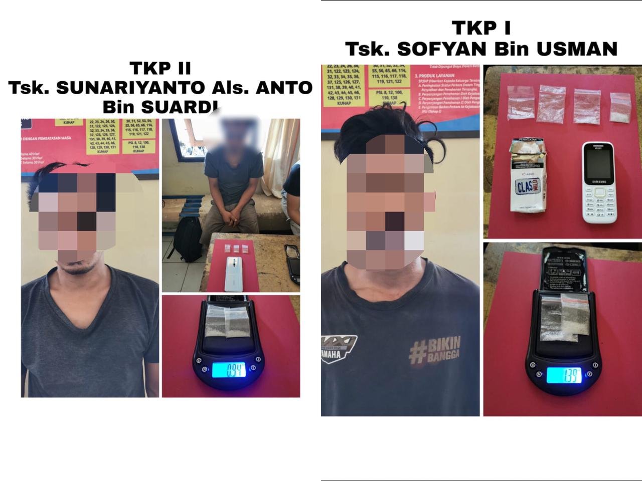 Kedua pelaku, yakni Sofyan (21) dan Sunarianto (26) diringkus di dua lokasi yang berbeda. Penangkapan kedua pelaku didasarkan oleh laporan masyarakat tentang adanya tindak penyalahgunaan barang haram tersebut.
