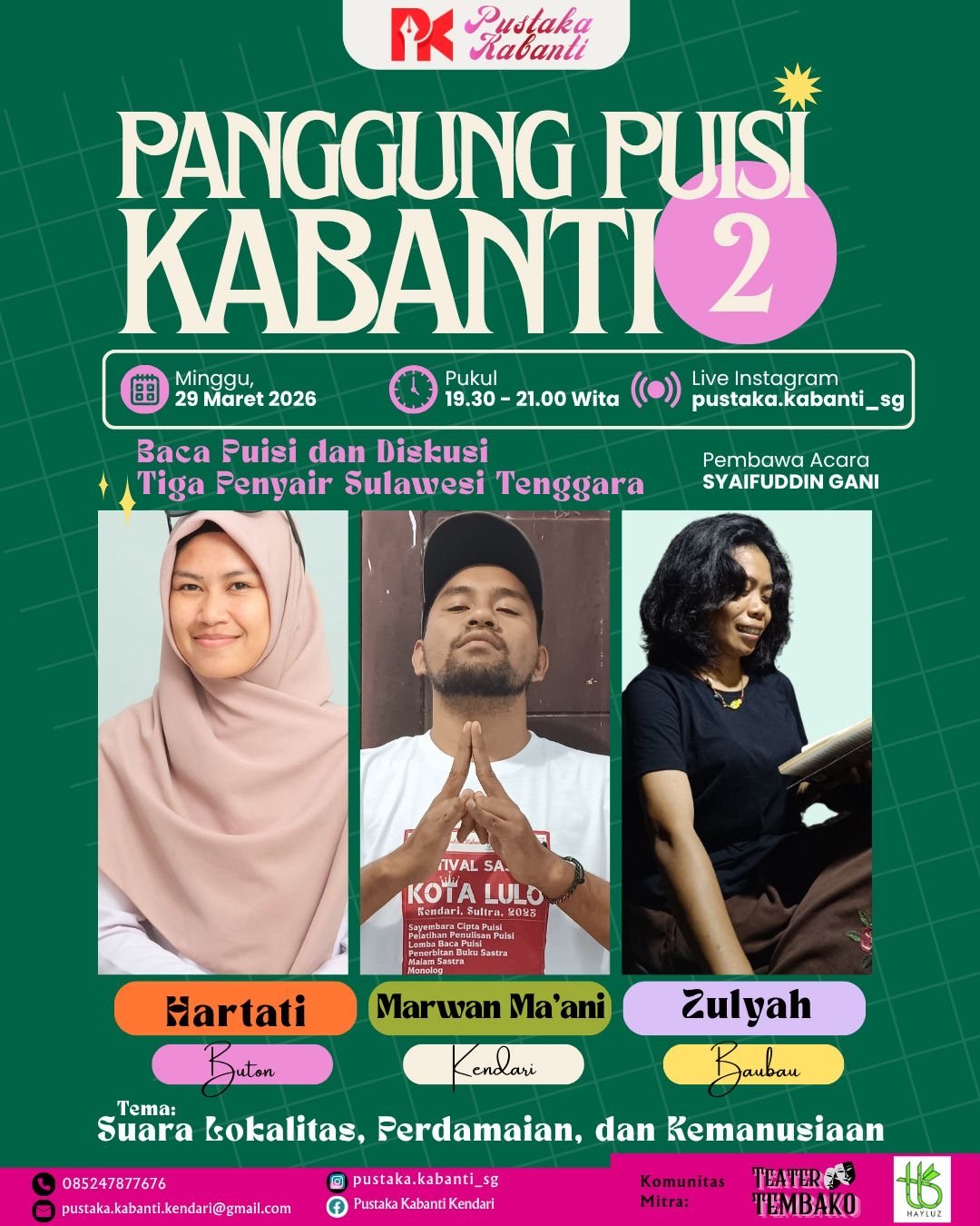 Kendari – Pustaka Kabanti Kendari kembali menghadirkan ruang apresiasi sastra melalui kegiatan Panggung Puisi Kabanti 2 yang akan digelar pada Minggu, (29/3/2026), pukul 19.30 – 21.00 Wita. Kegiatan ini disiarkan secara langsung melalui Instagram @pustaka.kabanti_sg.