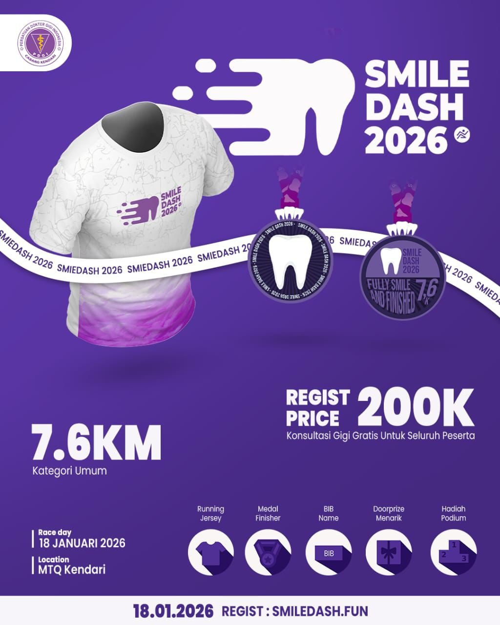 Pendaftaran telah dibuka melalui Instagram @pdgikendari_smiledashrun2026 atau melalui kontak panitia: Jessica (085190644569) dan Iim Masitoh (082271548626). Biaya pendaftaran ditetapkan sebesar Rp200.000.