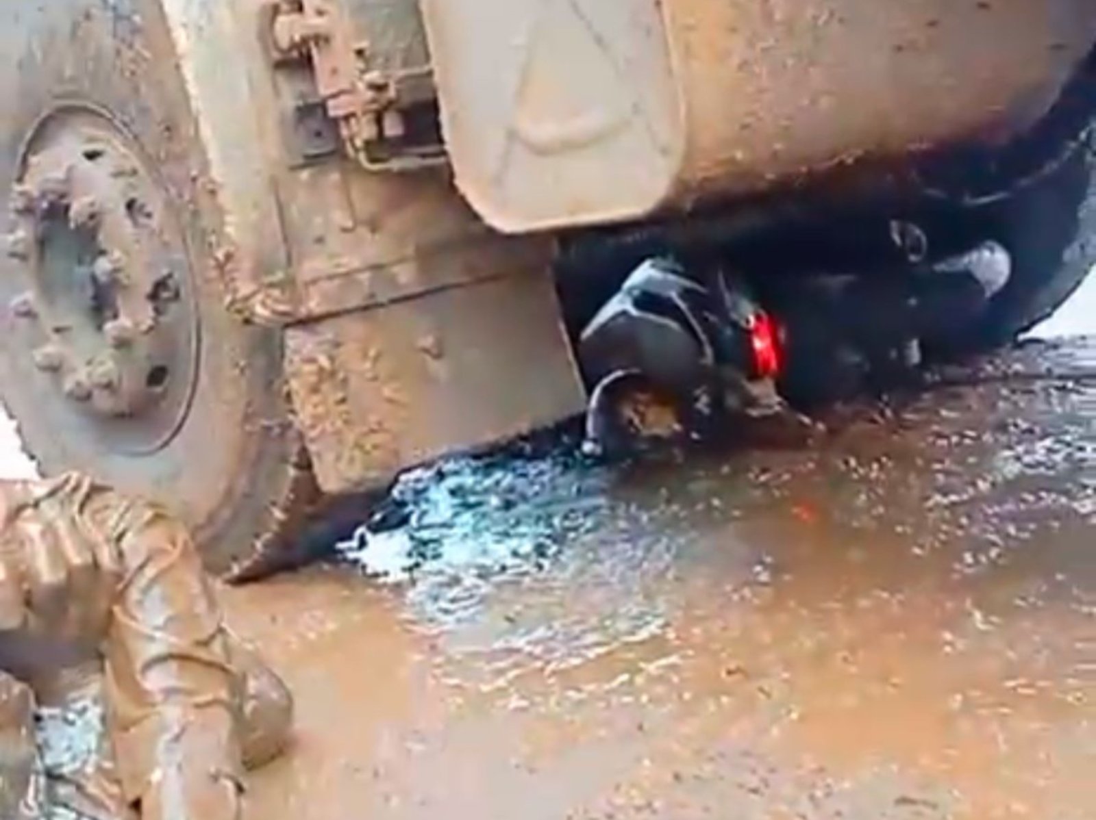 Video yang beredar memperlihatkan sepeda motor korban ringsek di bawah truk. Korban tergeletak bersimbah lumpur, sedangkan rekan-rekannya berlari panik berusaha mengevakuasi.