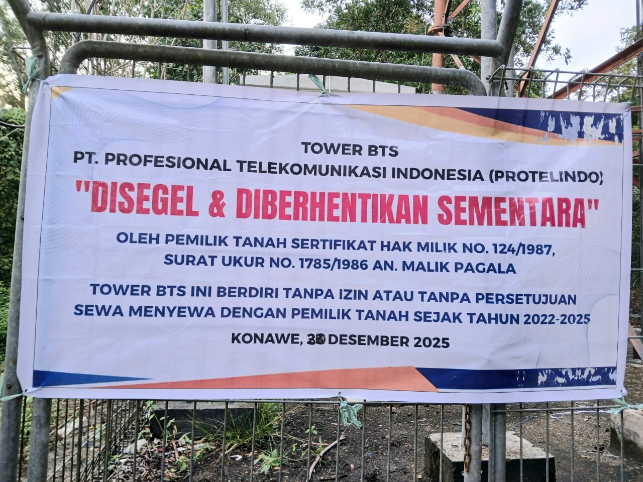 Konawe – Malik Pagala menyegel tower base transceiver station (BTS) milik perusahaan infrastruktur telekomunikasi PT Profesional Telekomunikasi Indonesia (Protelindo) di Desa Wonua Hoa, Kecamatan Lambuya, Kabupaten Konawe, Sulawesi Tenggara (Sultra). Penyegelan dilakukan Malik Pagala selaku pemilik lahan setelah tanah lokasi berdirinya tower BTS diklaim orang lain, Selasa (30/12/2025).
