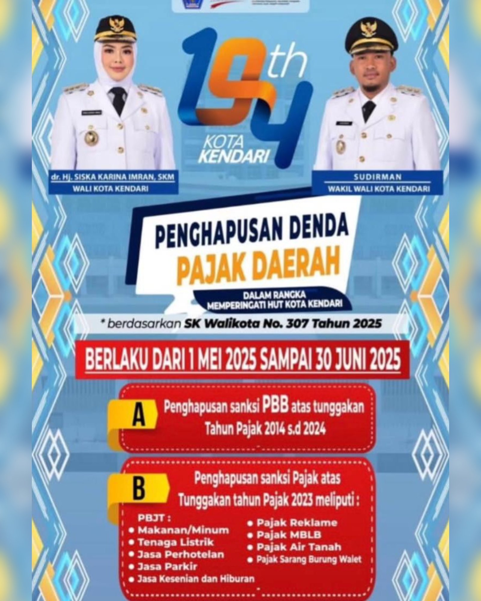 Kendari – Pemerintah Kota (Pemkot) Kendari menetapkan 30 Juni 2025 sebagai batas akhir pelaksanaan program penghapusan denda pajak daerah. Program itu merupakan bagian dari peringatan Hari Ulang Tahun (HUT) ke-194 Kota Kendari yang berlangsung sejak 1 Mei 2025 sesuai SK Wali Kota Kendari Nomor 307 Tahun 2025.