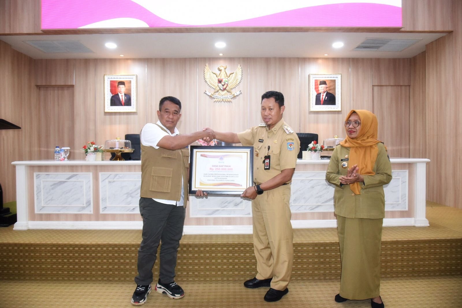 Bantuan tersebut diterima langsung oleh Penjabat (Pj.) Wali Kota Kendari Asmawa Tosepu dari Deputi Bidang Penanganan Darurat BNPB RI, Mayjen TNI Fajar Setiawan di Aula Balai Kota Kendari, Senin (20/3/2023).