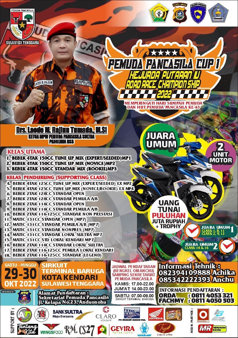 Kendari – Pengurus Pemuda Pancasila Wilayah Sultra mengadakan Kejuaraan Daerah Balap Motor Putaran IV Champion Ship Pemuda Pancasila Cup 1 dan Donor Darah di Kawasan Terminal Baruga, Kota Kendari, Sulawesi Tenggara (Sultra) yang dilaksanakan pada 29 dan 30 Oktober.