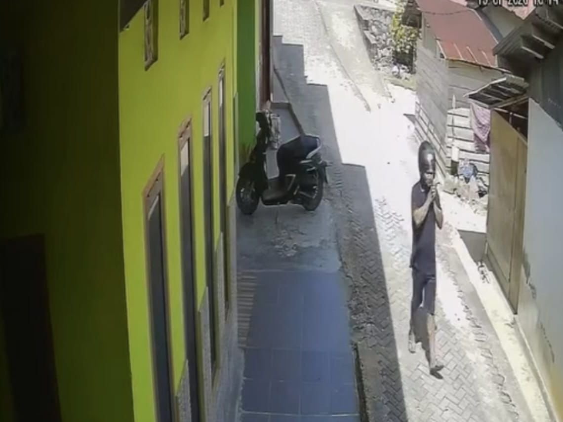 Dalam rekaman CCTV, pelaku terlihat mengenakan pakaian hitam dan celana pendek. Setibanya di lokasi, pria tersebut mematikan kunci kontak sepeda motornya lalu mendorong kendaraan tersebut menjauh dari lokasi.