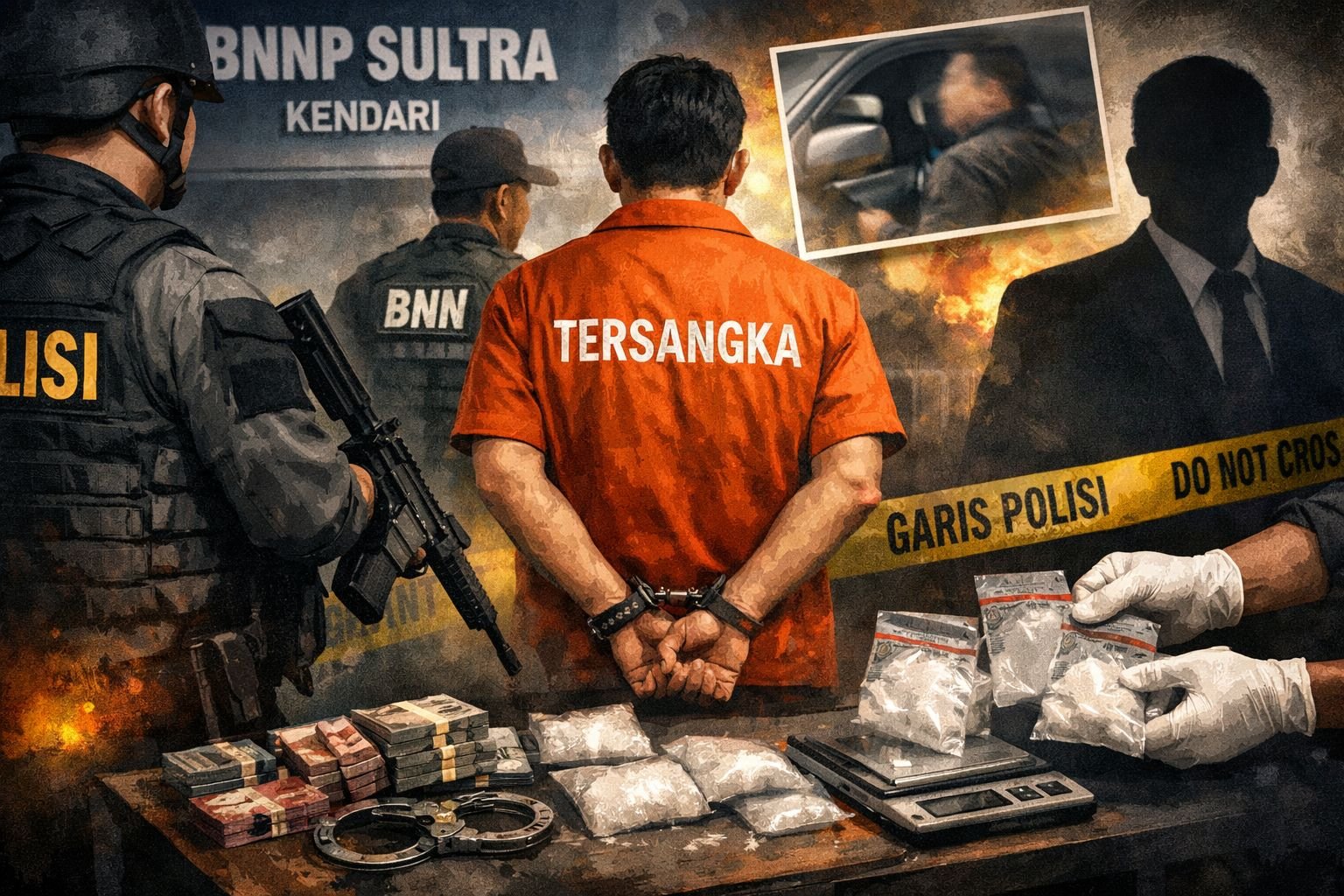 Petugas BNNP Sultra mengamankan tersangka kasus narkoba beserta barang bukti sabu-sabu. Foto: ChatGPT/AI.