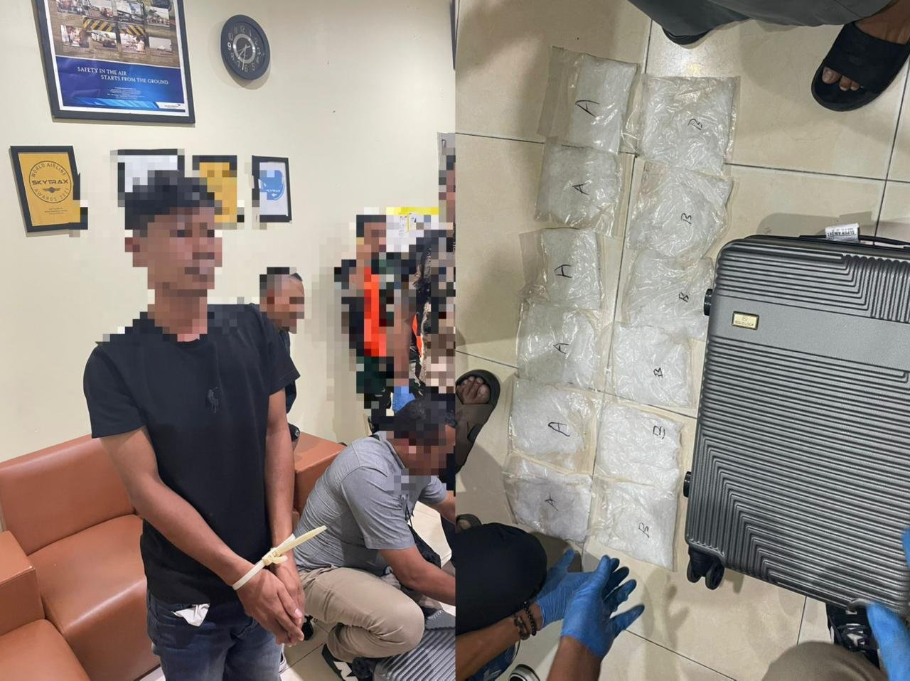 Penggeledahan dilakukan di ruang Lost and Found Ground Service Agent (GSA), area kedatangan Bandara Haluoleo Kendari. Dari hasil pemeriksaan koper milik pelaku, ditemukan 12 kantong sabu-sabu dengan berat bruto 2.030,8 gram.