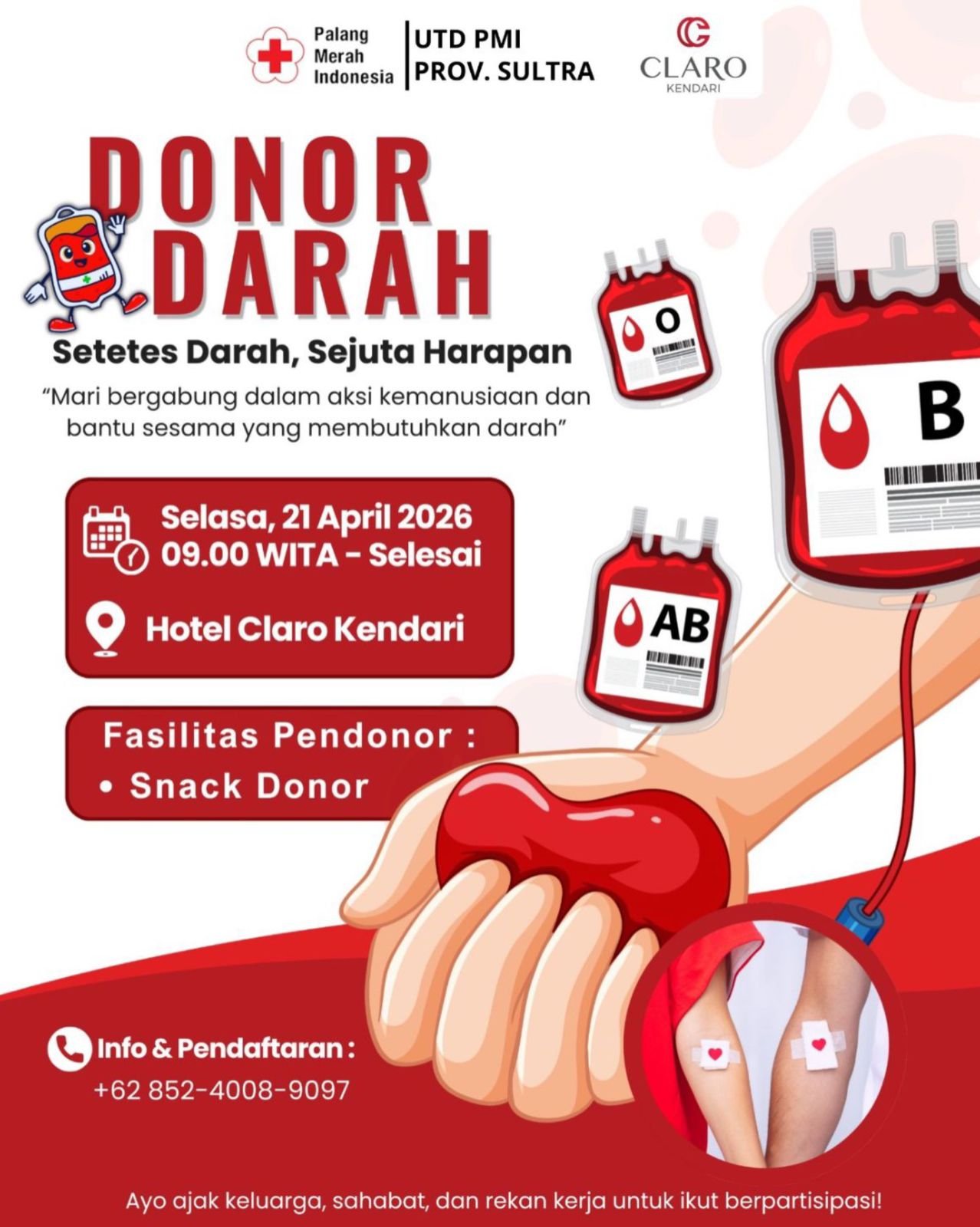 Marcomm Manager Claro Hotel Kendari, Irma, menyampaikan bahwa kegiatan tersebut merupakan bagian dari agenda rutin yang secara konsisten dilaksanakan. Ia juga mengajak masyarakat untuk turut berkontribusi langsung melalui kegiatan donor darah.