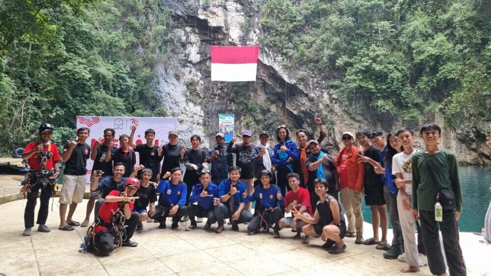 Kolaka Utara – Putra putri Sulawesi Tenggara (Sultra) yang tergabung dari beberapa komunitas mengibarkan bendera merah putih di dinding tebing Danau Biru, Kabupaten Kolaka Utara (Kolut). Pengibaran bendera dilakukan pada momen Hari Ulang Tahun (HUT) ke-79 Republik Indonesia (RI), Sabtu (17/8/2024) lalu.