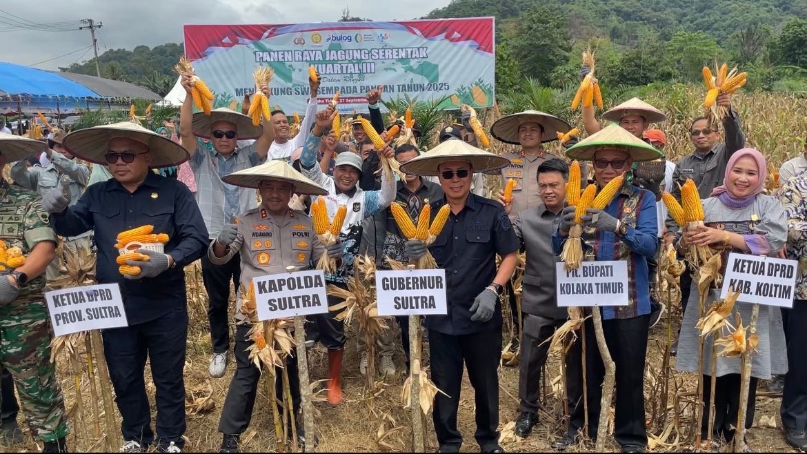 Kolaka Timur – Polda Sulawesi Tenggara (Sultra) bersama Forkopimda Sultra melaksanakan panen raya jagung serentak kuartal III tahun 2025 di Dusun 3, Desa Matabondu, Kecamatan Tirawuta, Kabupaten Kolaka Timur (Koltim), Sabtu (27/9/2025).