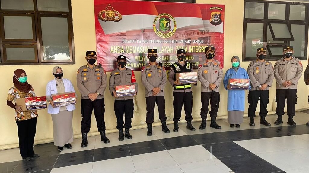 Kendari – Kepolisian Daerah (Polda) Sulawesi Tenggara (Sultra) memberikan bantuan sosial kepada para tenaga medis di Rumah Sakit Bhayangkara, Kota Kendari.