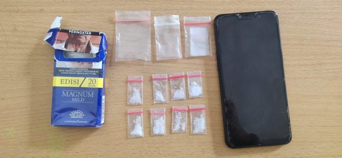 Dari hasil penggeledahan tersebut, ditemukan satu bungkus rokok yang berisikan satu saset klip serta delapan saset kristal yang diduga sabu-sabu dengan berat 1,28 gram yang disimpan di saku celana sebelah kanan bagian depan.