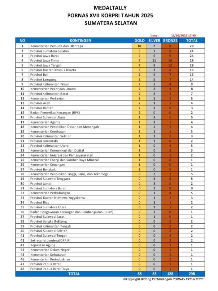 “Pornas Korpri XVII 2025 bukan sekadar ajang kompetisi, akan tetapi ruang kebersamaan, tempat kita belajar bahwa kekuatan birokrasi tidak hanya lahir dari kecerdasan dan kebijakan, tetapi juga dari jiwa yang sehat, semangat yang tangguh, dan kebersamaan yang tulus,” ujarnya di Palembang dikutip website resmi Kementerian PAN-RB, Sabtu (11/10).