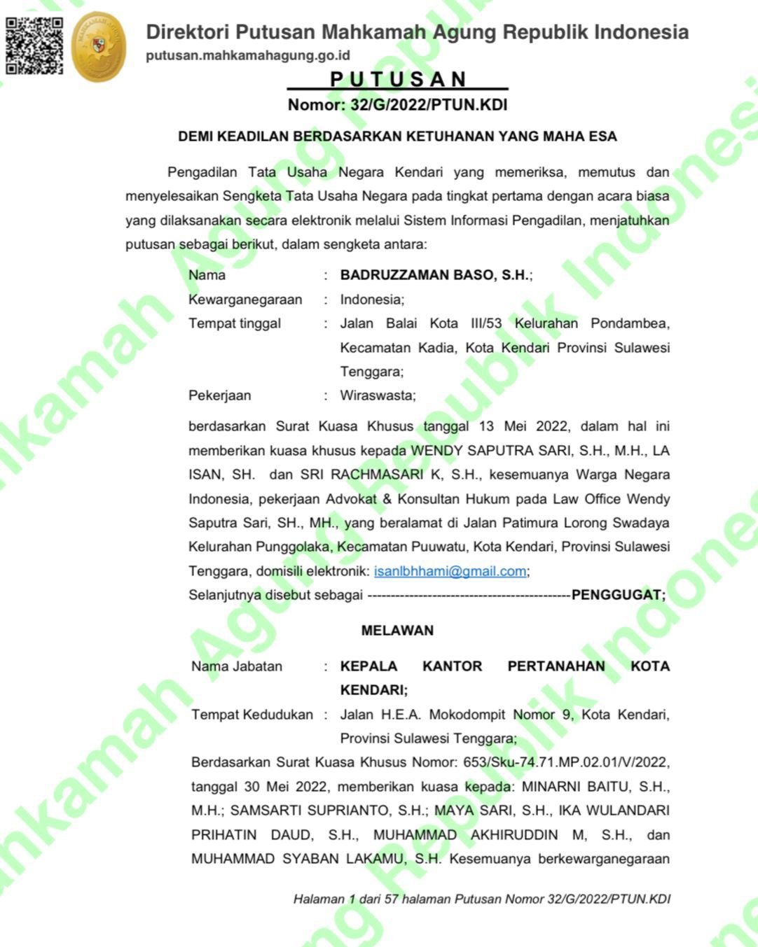 Perkara ini sebelumnya telah diputus oleh Pengadilan Tata Usaha Negara (PTUN) Kendari melalui Putusan Nomor: 32/G/2022/PTUN.Kdi. Dalam amar putusan tersebut, majelis hakim menyatakan batal Keputusan Kepala Kantor Pertanahan Kota Kendari Nomor: 38/Kep-100.2/IV/2018 tentang Pembatalan Sertipikat atas nama Baso Suamir tertanggal 25 April 2018.