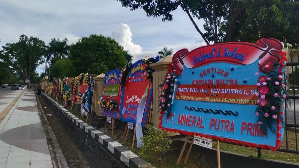 Kendari – Menyambut kedatangan Kepala Kepolisian Daerah (Kapolda) Sulawesi Tenggara (Sultra) yang baru, Irjen Pol Teguh Pristiwanto di Kota Kendari, puluhan karangan bunga yang dibubuhi ucapan selamat datang menghiasi bagian depan Mapolda Sultra, Kamis (11/11/2021).
