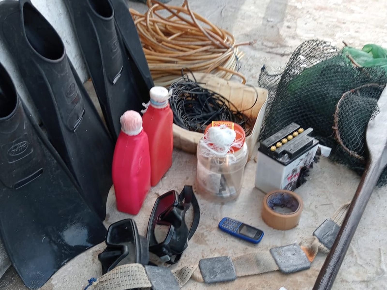 Kemudian, satu gulung kabel hitam, 1 buah aki merek Yuasa (meledak bekas kontak BB), 1 buah gabus Styrofoam bekas BB yang dibuang, 2 buah sepatu katak selam, 2 gulung alat selang menyelam, dan 4 buah sendok ikan (bundre).