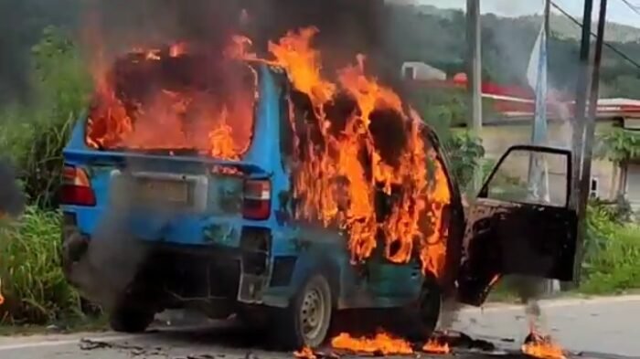 Kendari – Sebuah angkutan kota (angkot) atau pete-pete hangus terbakar di depan Stasiun Pengisian Bahan Bakar Umum (SPBU) Teratai, Kelurahan Watuwatu, Kecamatan Kendari Barat, Kota Kendari, Sulawesi Tenggara (Sultra), Sabtu (23/10/2021).