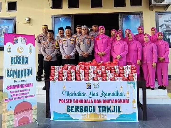 Konawe – Personel Polsek Bondoala dan pengurus Bhayangkari ranting Bondoala menyuguhkan indahnya Ramadan melalui pembagian takjil buka puasa di Jalan Poros Desa Laosu, Kecamatan Bondoala, Kabupaten Konawe, Minggu (9/3/2025).