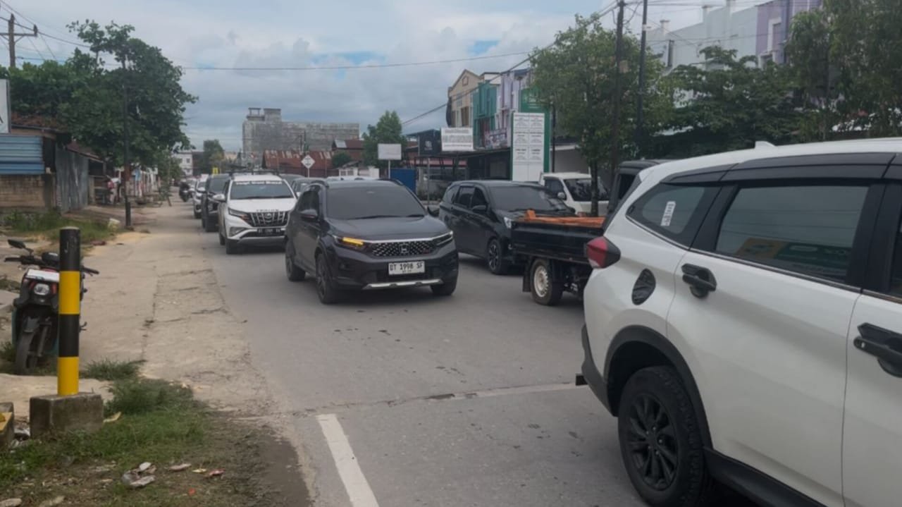 Kendaraan memadati Jalan Abunawas, karena kawasan Tapak Kuda, Kelurahan Korumba, Kecamatan Mandonga, Kota Kendari, Sulawesi Tenggara (Sultra), diblokir warga penolak konstatering. Foto: Kendariinfo. (30/10/2025).