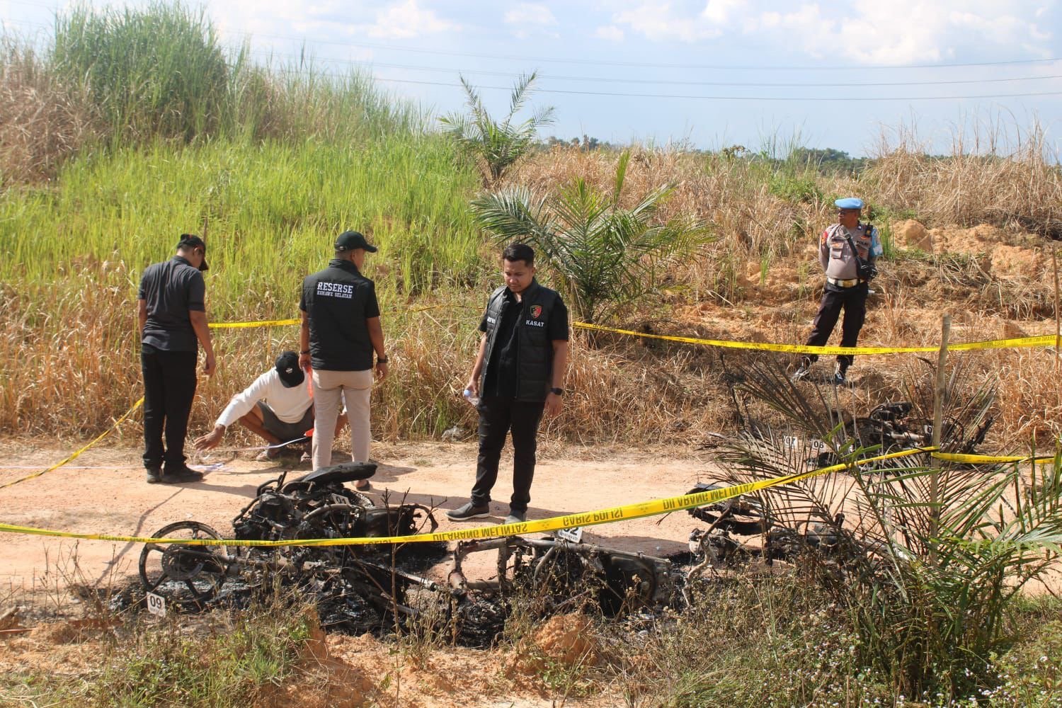 Polisi saat melakukan olah TKP pembakaran empat motor karyawan PT Marketindo Selaras di Kabupaten Konawe Selatan. Foto: Istimewa. (29/7/2025).