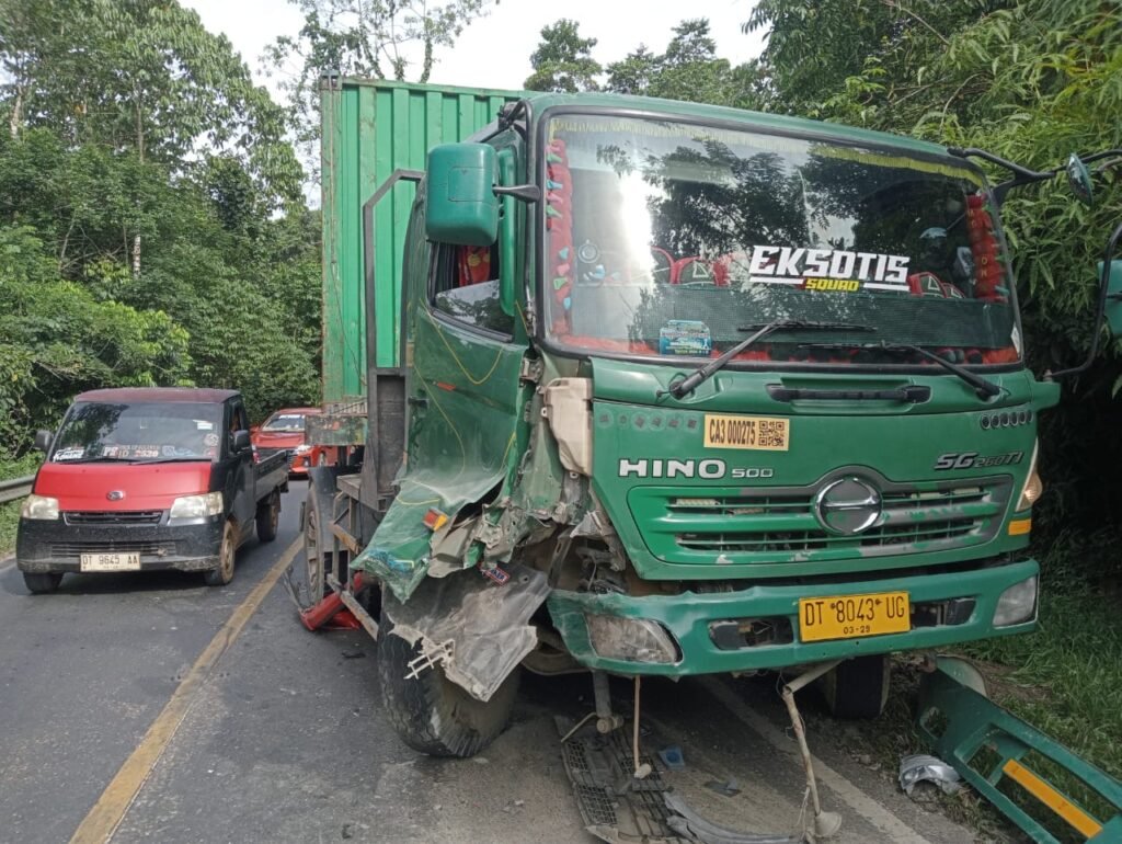 Saat melintasi jalan menikung dan penurunan, truk tersebut melebar ke sisi jalan hingga menabrak minibus warna merah dengan nomor polisi DT 1474 IA yang bergerak dari arah berlawanan. Akibat kejadian itu, kedua kendaraan terlibat tabrakan keras dan bagian depannya mengalami kerusakan parah.