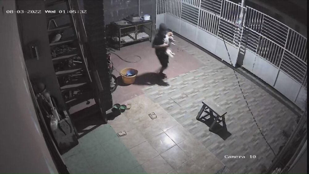 Tak Lama kemudian, seorang pria datang dengan memanjat pagar samping lalu melompat masuk ke area teras rumah korban. Si pria mengenakan baju kaos, dan celana pendek dengan hati-hati berjalan mendekati anjing lalu menggendongnya keluar melalui pagar samping rumah.