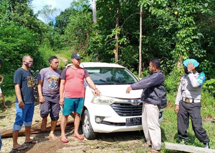 Personel Polsek Bonegunu sedang mengamankan mobil Toyota Avanza putih di Butur. Foto: Polres Butur.