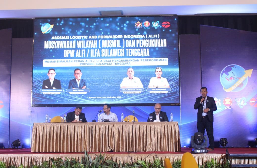 Kendari – Asosiasi Logistik dan Forwarder Indonesia (ALFI) atau Indonesian Logistics dan Forwarders Association (ILFA) Sulawesi Tenggara (Sultra) menggelar Musyawarah Wilayah (Muswil) I di Kota Kendari, Kamis (26/10/2023). Dalam muswil tersebut, Abd. Rahim Nabok terpilih aklamasi sebagai nakhoda baru ALFI Sultra periode 2023 – 2028.