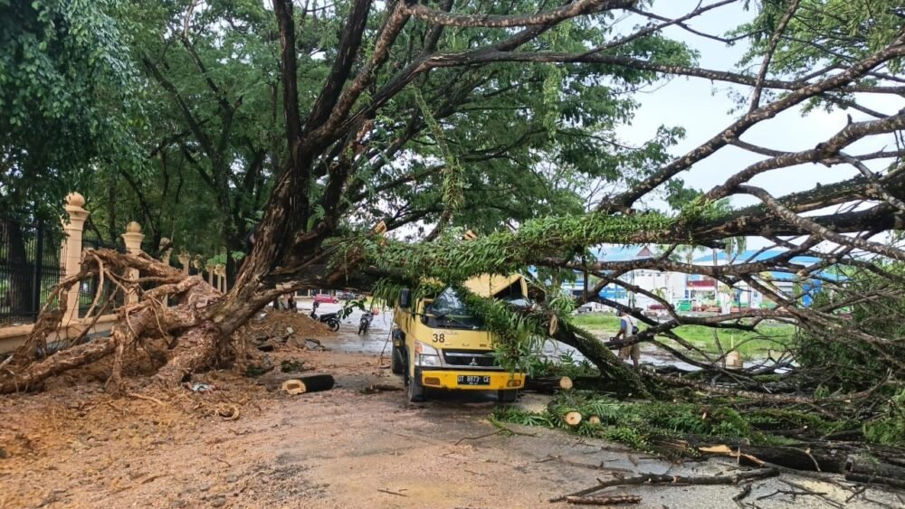 Kendari – Sebuah truk pengangkut material timbunan untuk proyek penataan kawasan Pedestrian Eks MTQ tertimpa pohon di Jalan Tebaununggu, Kelurahan Korumba, Kecamatan Mandonga, Kota Kendari, Sulawesi Tenggara (Sultra), Selasa (18/11/2025) sekitar pukul 15.30 Wita. Insiden terjadi saat hujan mengguyur kawasan tersebut.