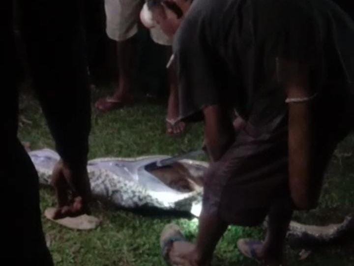 Dalam video amatir warga, bagian perut ular tersebut tampak membesar. Selanjutnya, salah seorang warga mengambil parang dan menyayat perut ular yang sudah mati itu.