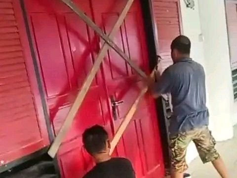 Tak hanya disegel, bangunan yang terletak di Kelurahan Arombu, Kecamatan Unaaha, Kabupaten Konawe, Sulawesi Tenggara (Sultra), itu juga dipasangkan spanduk berisi protes pekerja yang menuntut pemberian haknya.