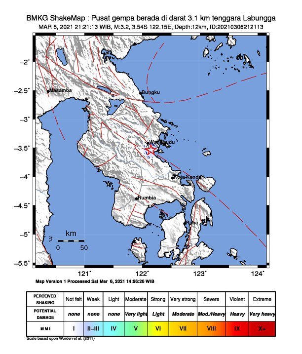 Hasil analisis BMKG menunjukkan gempa kali ini berkekuatan 3.2 Skala Richter (SR), dengan episenter gempa terletak pada koordinat 3.54 Lintang Selatan (LS), 122.15 Bujur Timur (BT) atau tepatnya berlokasi di darat pada jarak 3.1 km, di kedalaman 12 km.