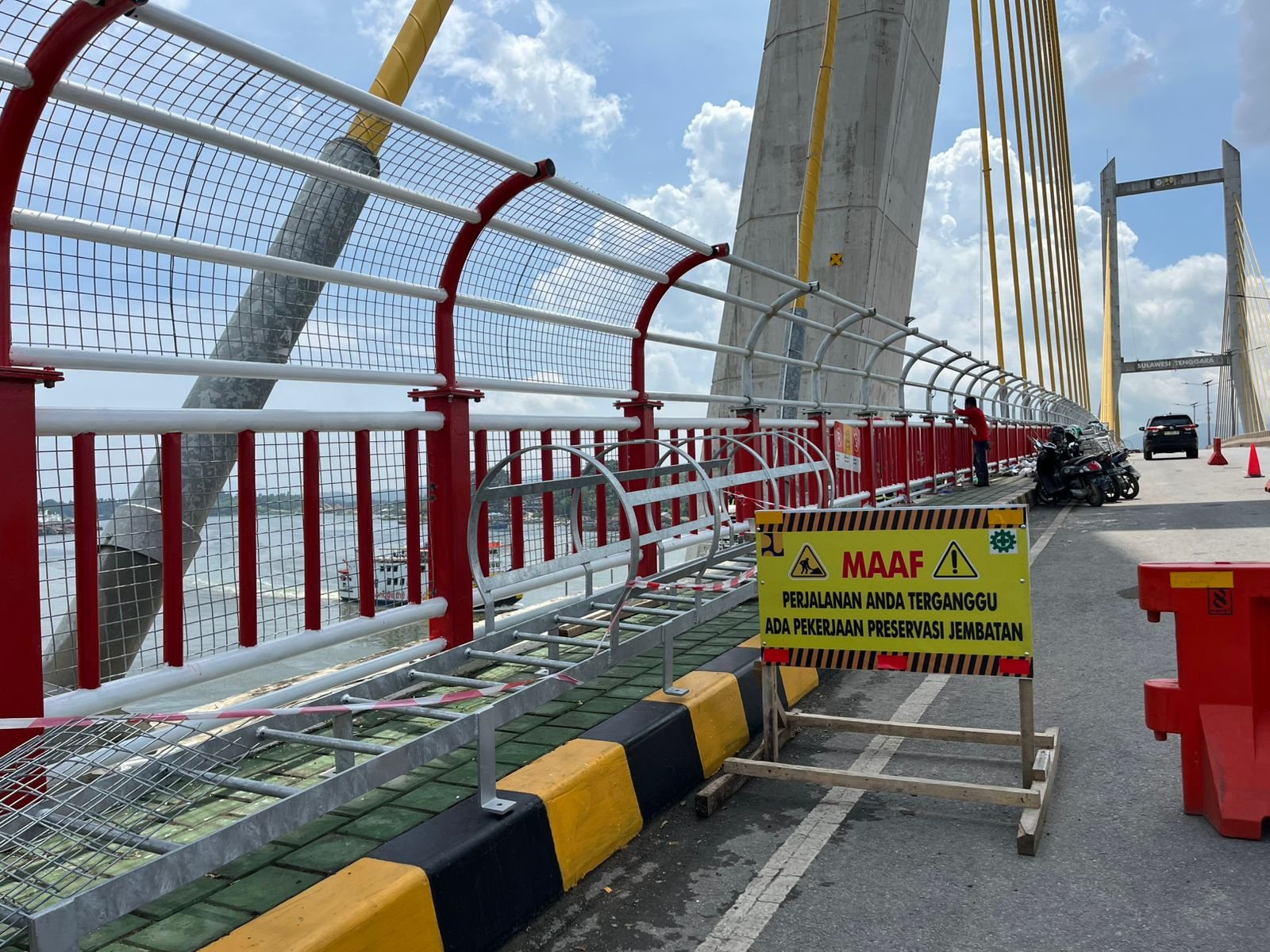 Berdasarkan pantauan Kendariinfo, Rabu (17/12/2025), aktivitas pemasangan pagar pembatas masih berlangsung. Sebagian besar struktur pagar telah terpasang, dengan tampilan dominan warna merah berpadu putih yang mencolok di sepanjang jembatan.