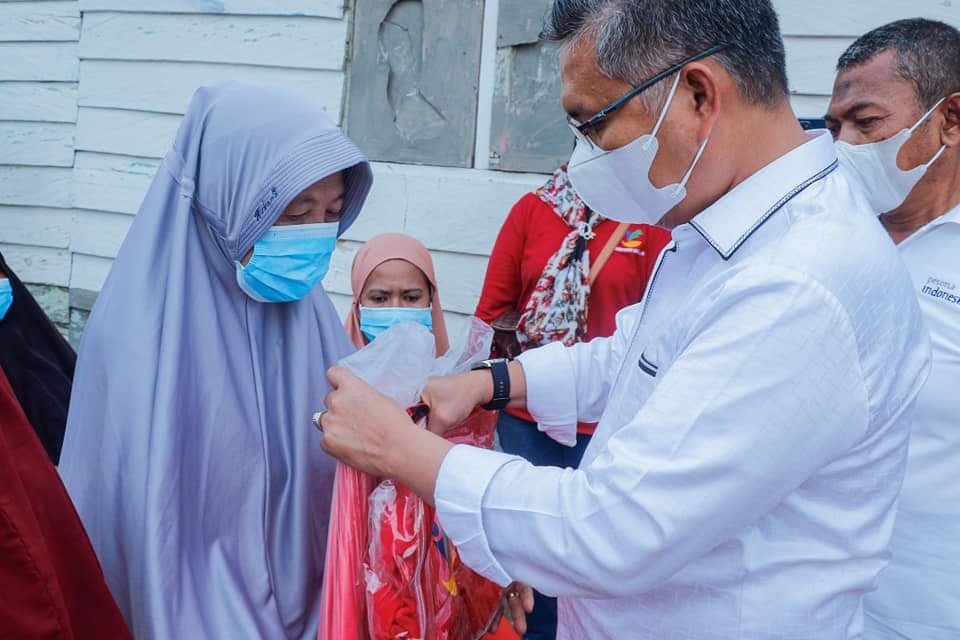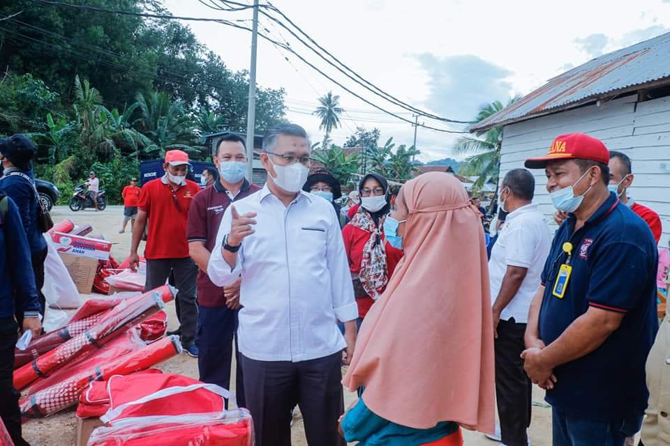 Kendari – Wali Kota Kendari, Sulkarnain Kadir memberikan bantuan kepada warga yang terdampak bencana angin puting beliung di Kelurahan Sambuli dan Kelurahan Nambo, Jumat (31/12/2021).