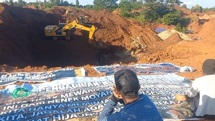 Dua ekskavator PT WIN tampak melakukan penggalian pada kedalaman 20 meter. Di sekitar galian terlihat warga pemilik lahan yang berjaga bersama beberapa karyawan PT WIN. Warga kemudian membentangkan baliho kutipan majelis hakim di Pengadilan Negeri (PN) Andoolo yang memutus perkara dua warga Torobulu pada 2024 lalu.