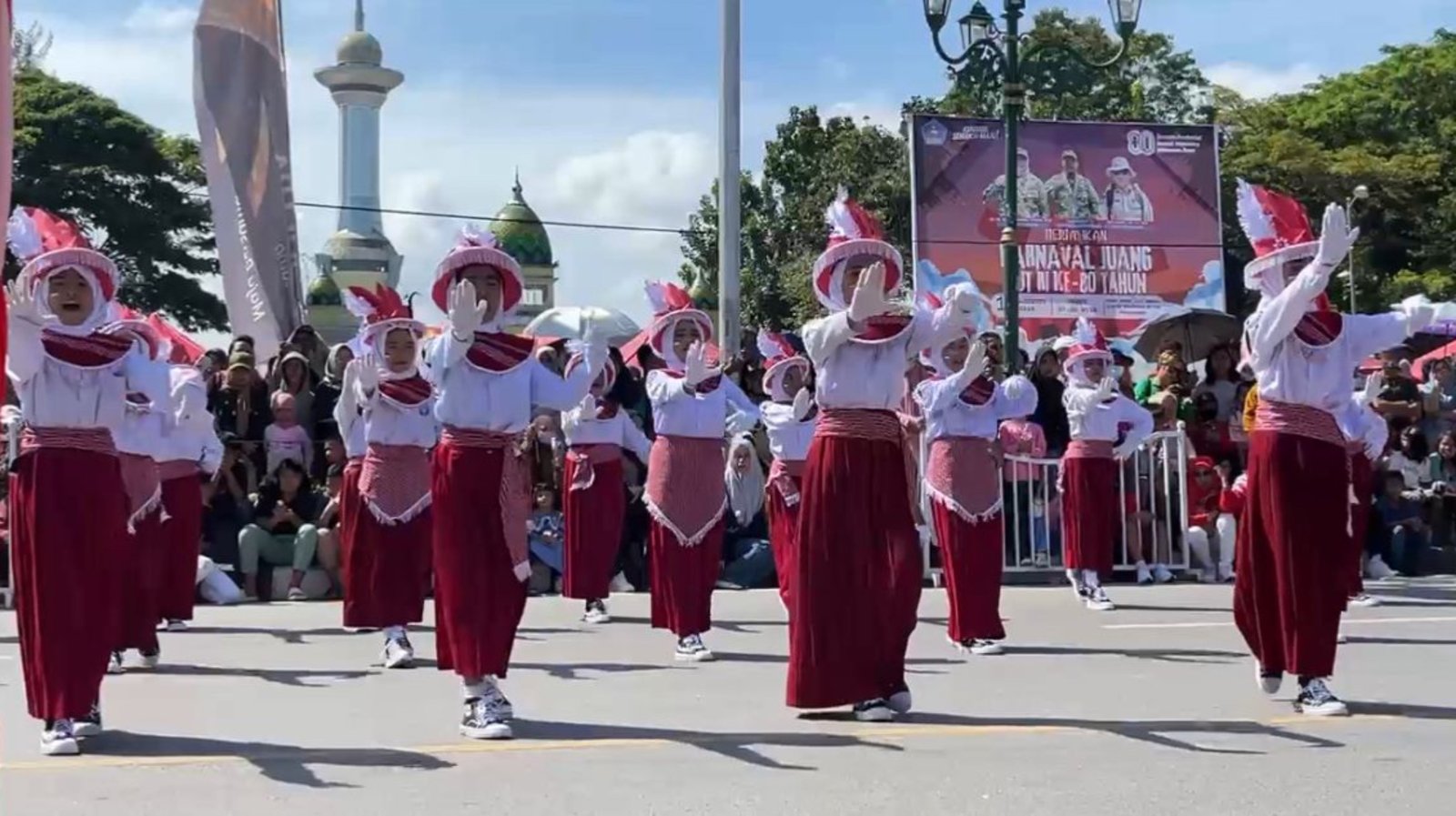 Mulai dari seragam merah-putih, batik, hingga pramuka. Kreativitas mereka semakin menonjol berkat aksesori unik, seperti kain adat, topi bulu ayam, replika tugu Eks MTQ, dan baret berwarna-warni. Keramaian juga terasa di sekitar panggung penghormatan. Warga yang memadati tepi jalan tetap tertib di balik pagar pembatas sambil memberi semangat kepada para peserta.